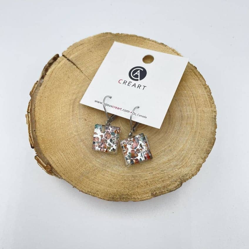 Composé d'une pièce de verre colorée mesurant 13 millimètres et de crochets en acier inoxydable.