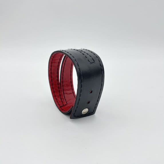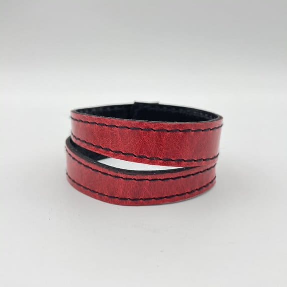 Fait de cuir et d'une attache en acier inoxydable. Il est fait 100% à la main, au Saguenay-Lac-St-Jean. Il est réversible et facile à mettre au poignet. Il est doté de 3 trous d'ajustement et convient ainsi à tous les poignets.