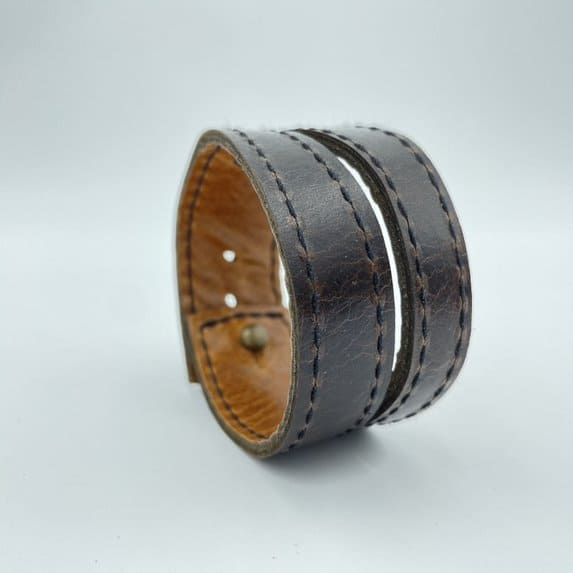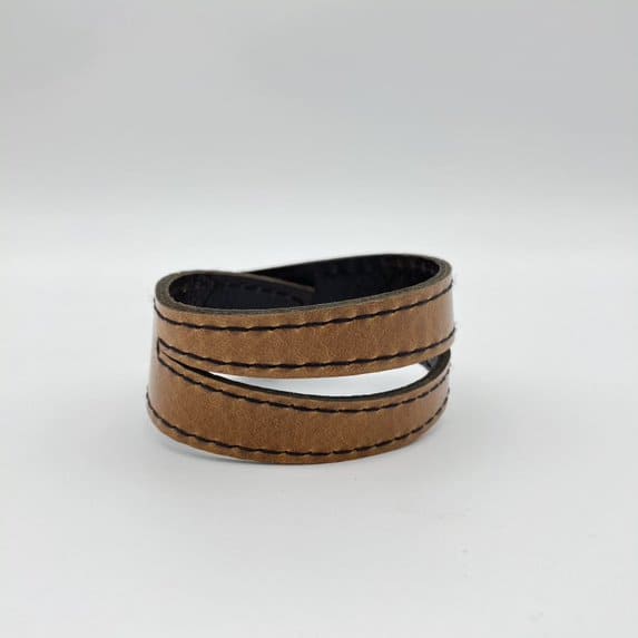 Fait de cuir et d'une attache en acier inoxydable. Il est fait 100% à la main, au Saguenay-Lac-St-Jean. Il est réversible et facile à mettre au poignet. Il est doté de 3 trous d'ajustement et convient ainsi à tous les poignets.